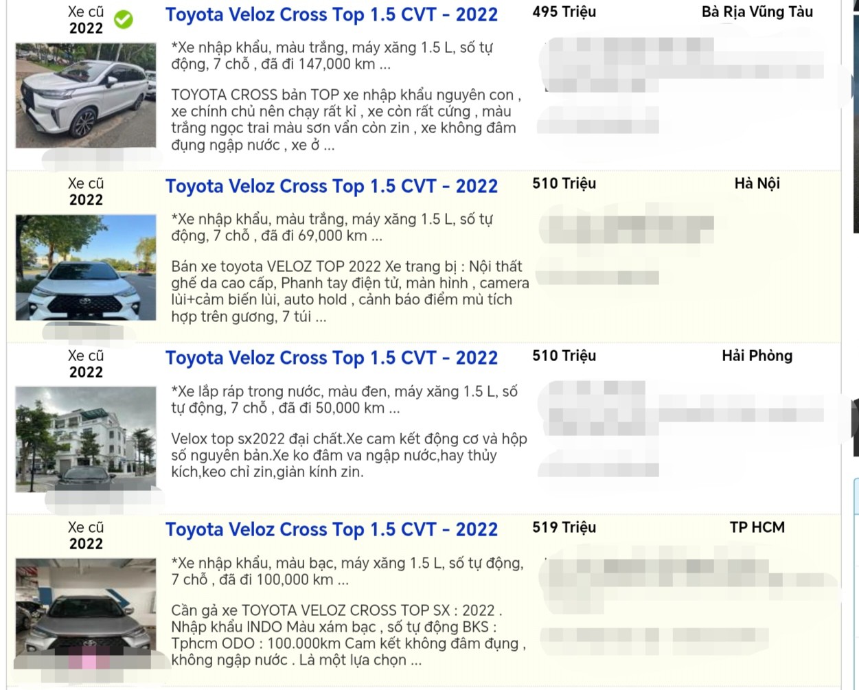 Trường hợp còn lại đến từ TP.HCM, chiếc Toyota Veloz Cross Top 1.5 CVT 2022 màu bạc, odo 100.000 km, được rao 519 triệu đồng. Xe nhập khẩu Indonesia, cam kết không đâm đụng, không ngập nước và được giới thiệu là lựa chọn phù hợp trong tầm giá. Dù odo cao hơn mức trung bình, giá 519 triệu phản ánh nhu cầu MPV tại TP.HCM vốn luôn sôi động, khiến biên độ giảm giá ít hơn so với nhiều tỉnh thành khác.