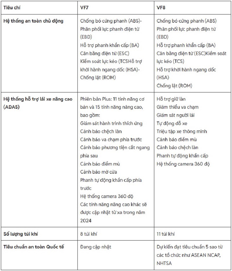 So sánh xe VF7 và VF8 về tính năng an toàn